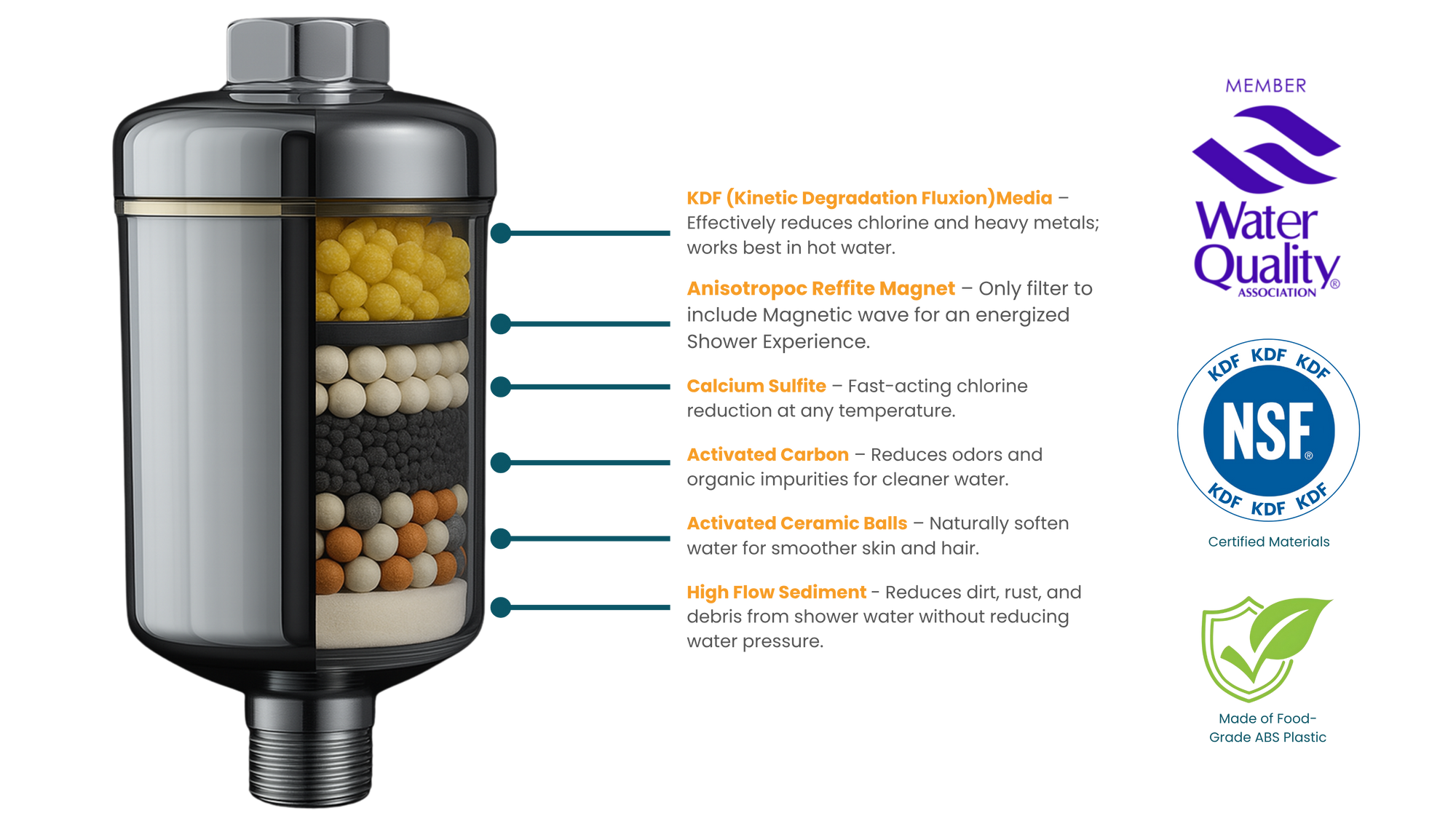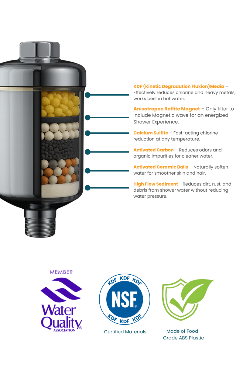 Heavy Metal Filtration: Filters out heavy metals, protecting your skin and health during showers.