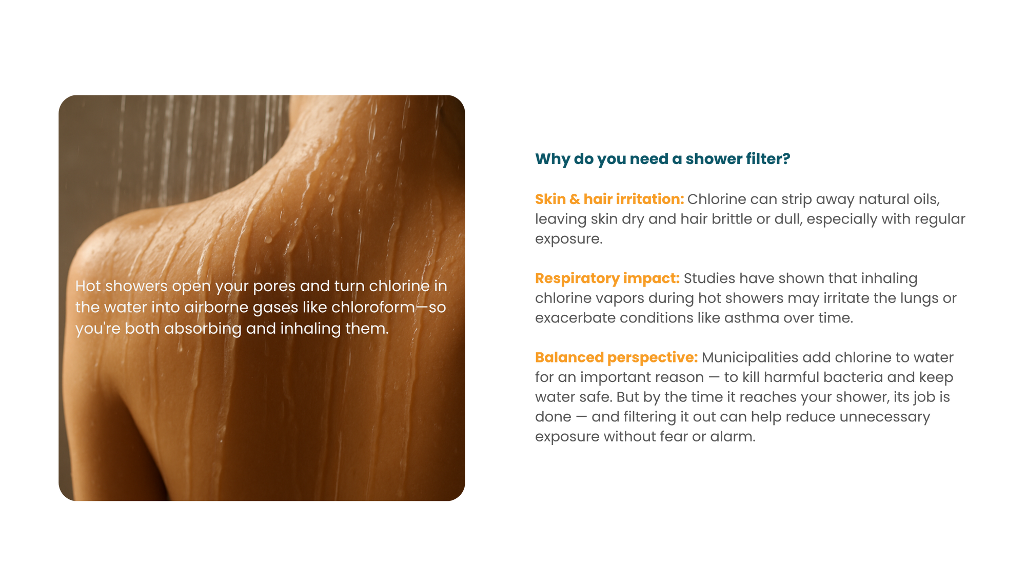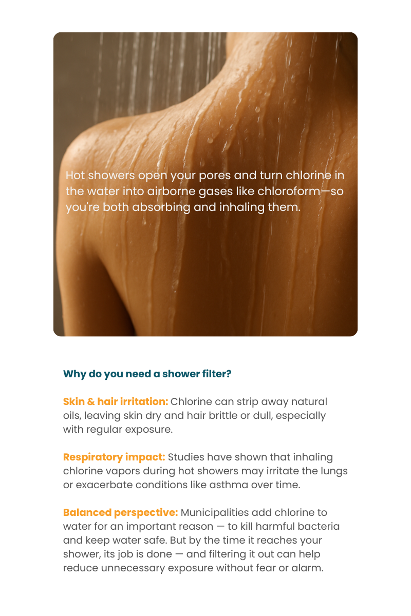 Stop chlorine damage; start showering in purity with us. Using the KLEENplus Shower Filter can enhance the quality of your shower water and contribute to a more enjoyable and beneficial bathing experience