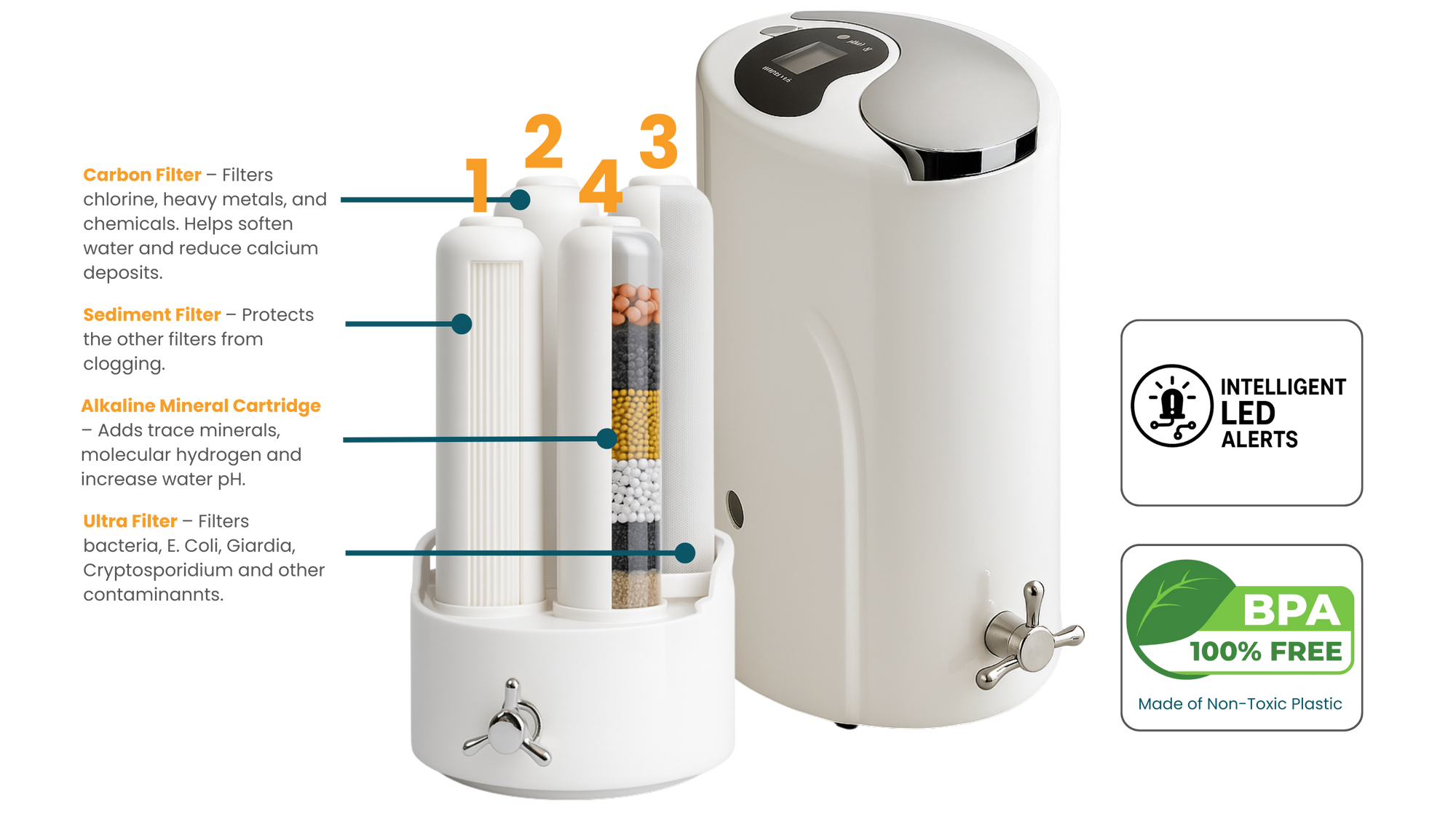 Filters: With its 3 filters and 1 mineral cartridge, the Alka Flow provides superior purification for city water, effectively removing chlorine, heavy metals, chemicals, agri-chemicals, micro-plastics, and even some fluoride.