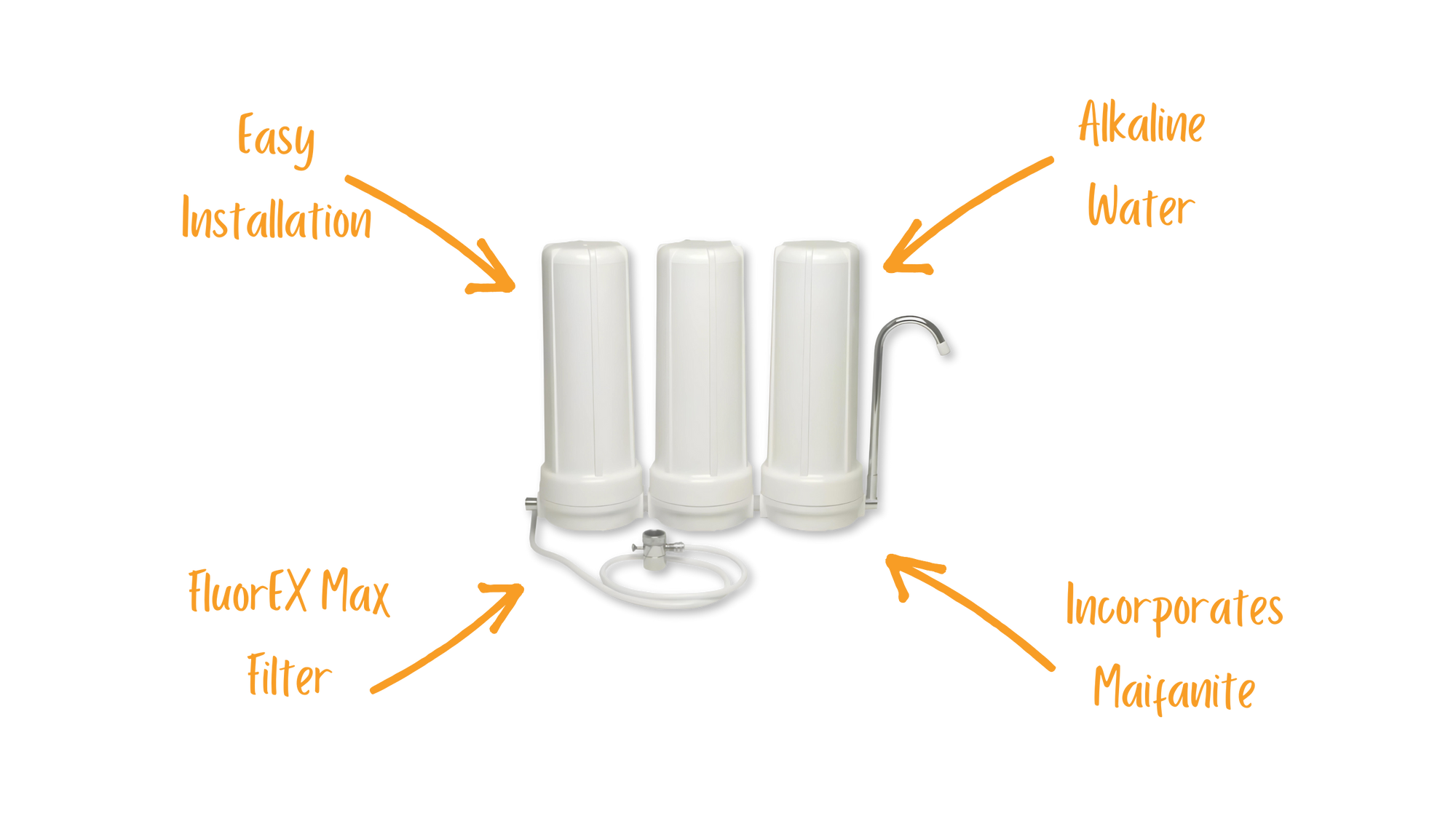 The system consists of three cartridges/housings that work together to provide exceptional water quality. The first cartridge/housing is the Active Pure 1 Yr - KDF & Carbon Slimline 10" filter, specifically designed to remove chlorine, and chloramine. The second cartridge/housing is the FluorEX Max - fluoride removal filter, which uses revolutionary technology to eliminate fluoride to non-detectable levels*. It is an all-natural cartridge that is free from alumina. Lastly, the third cartridge/housing is the Bio-mineral Housing with Media, containing mineral ionizing alkalizing media that ensures your water has a pH of 9.5 and provides strong antioxidants in the form of hydrogen.