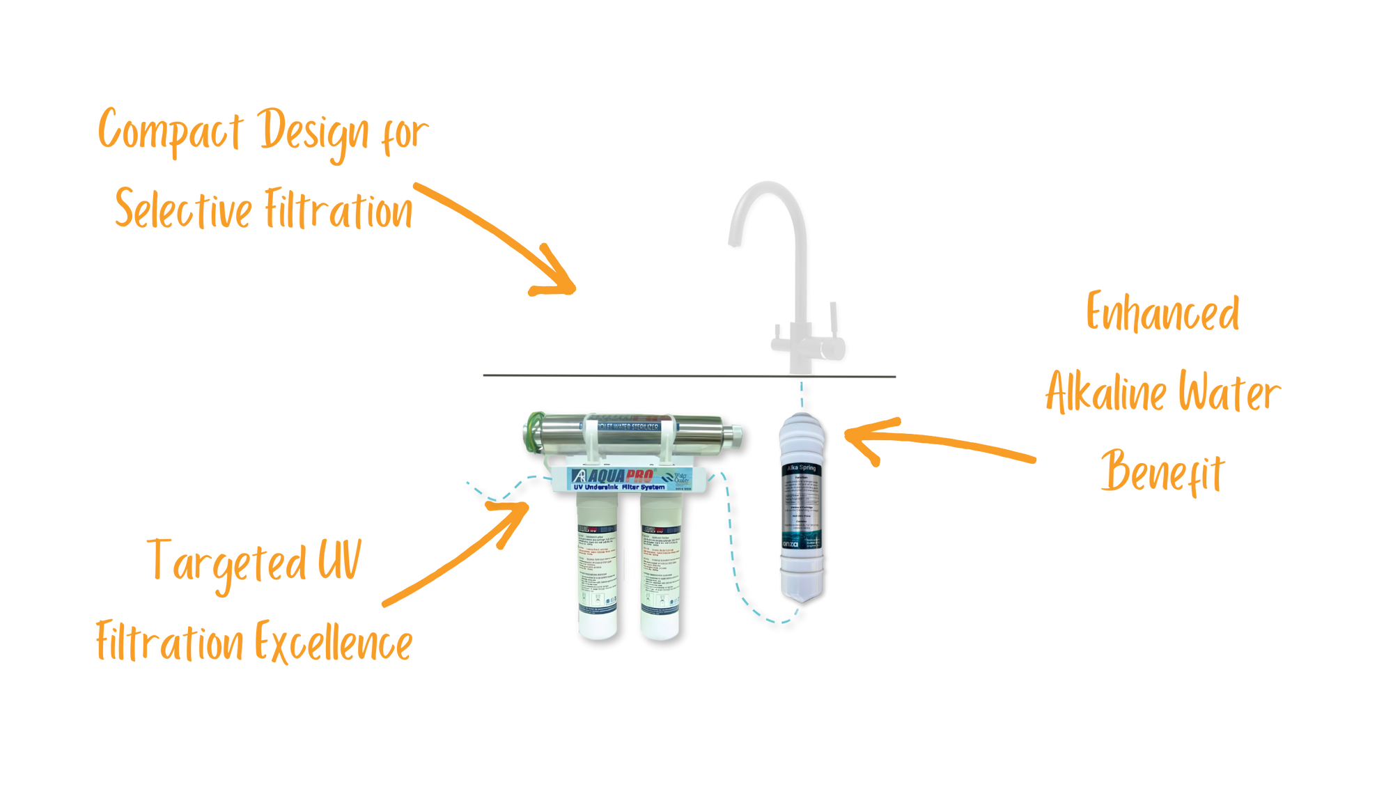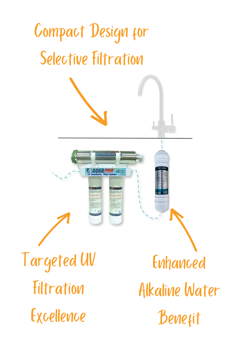 The ALKA UV Underbench System with Alka Spring post filter Cartridge, specifically the Aquapro UV Undersink Filter system, is a highly regarded solution for addressing rural water issues directly at the point of usage, promoting tranquility in water consumption, particularly in the kitchen. This system incorporates UV technology to effectively kill bacteria, E. coli, and cysts inside the water, providing peace of mind and eliminating the need for boiling or concerns about water safety.