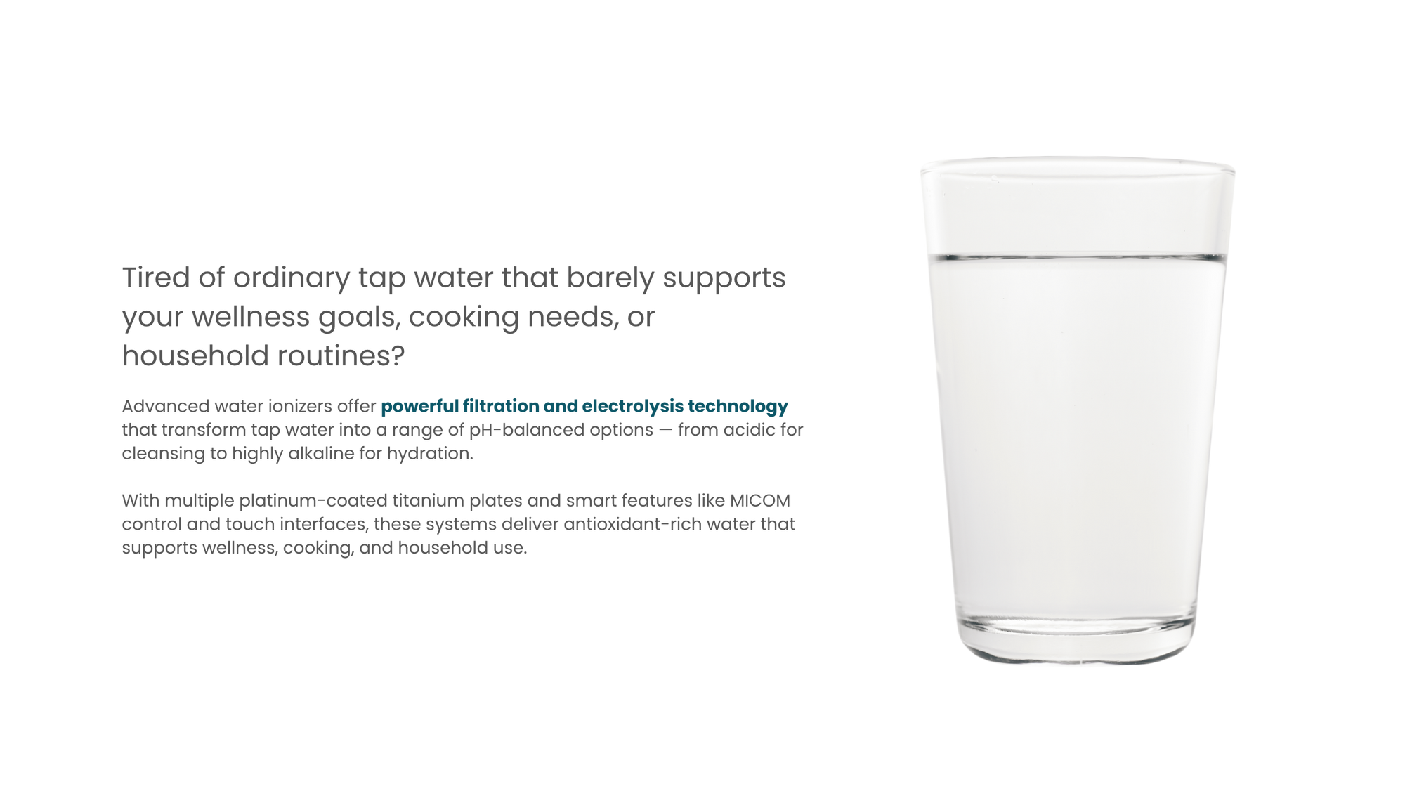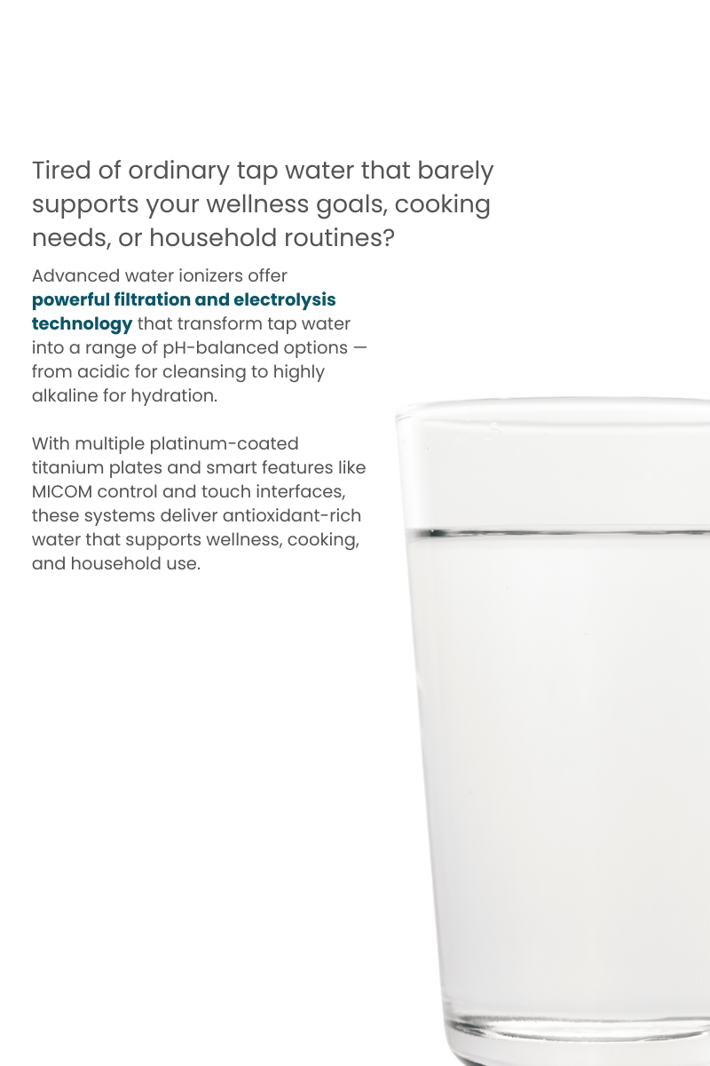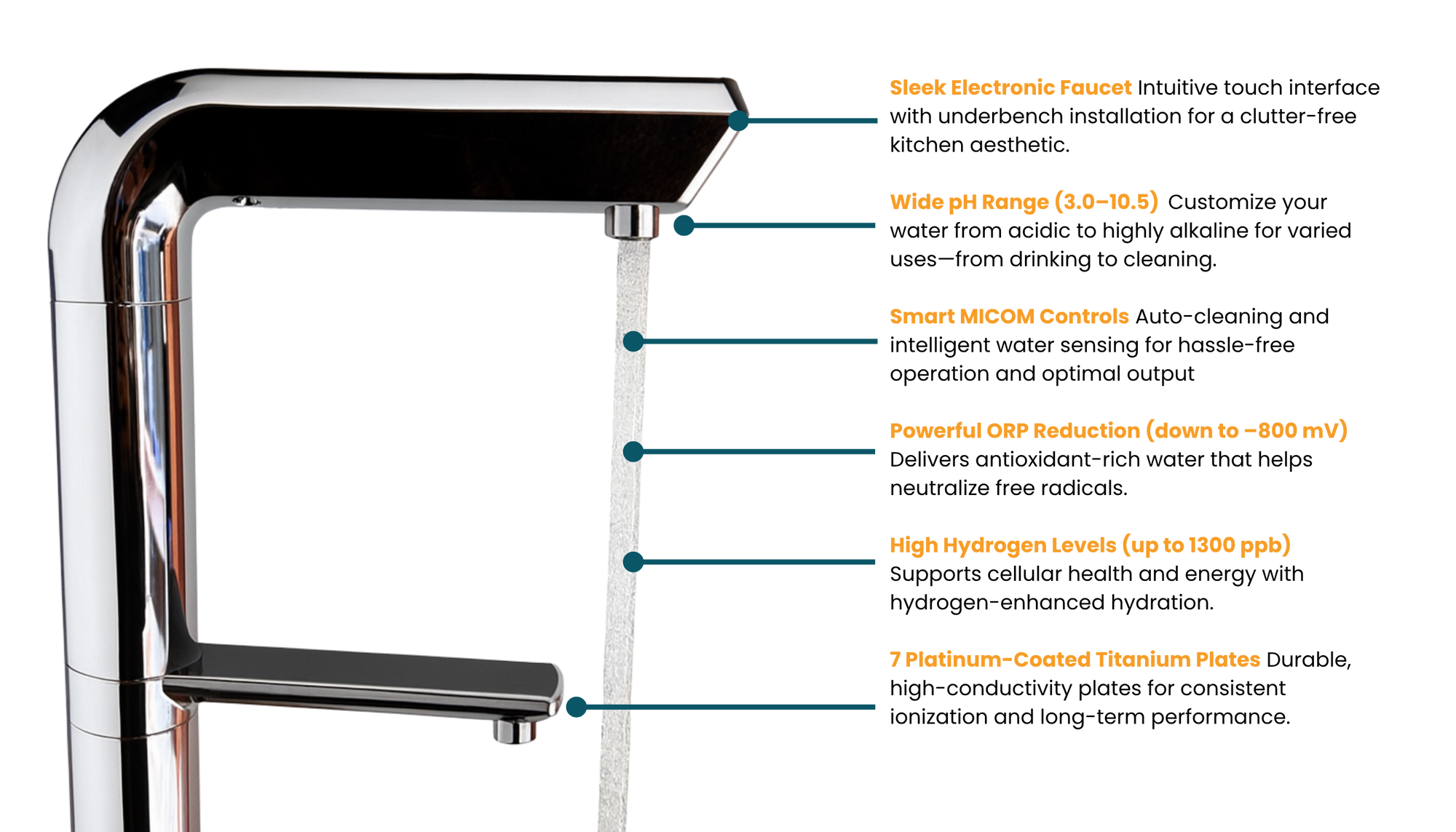 Using platinum-coated titanium plates and precise electrolysis, the IonPlus restructures water to achieve a wide pH range (3.0–10.5), a negative ORP of up to -800mV, and a rich supply of dissolved hydrogen. This type of water is often associated with improved hydration, detox support, and antioxidant potential, although science has yet to confirm consistent health outcomes. Many people still choose ionized water as part of a proactive, health-conscious lifestyle—and discover their own reasons for loving it.