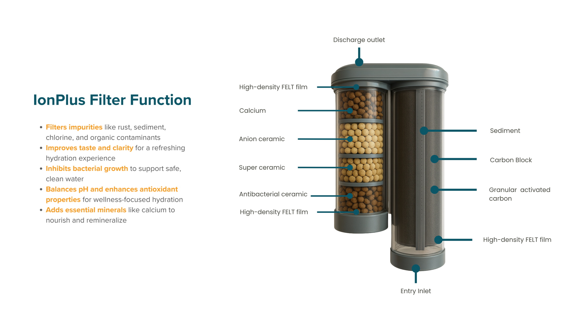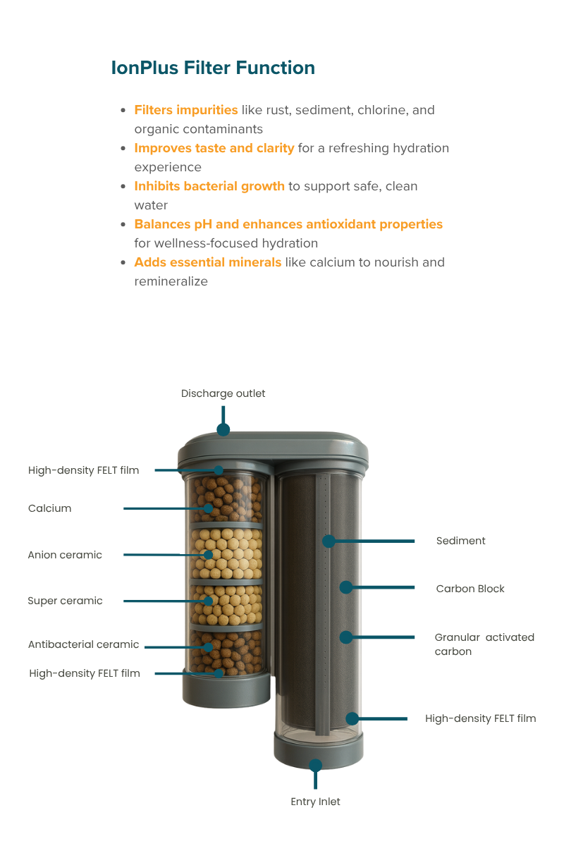 With user-friendly presets, self-cleaning features, and reliable filtration, the IonPlus is a smart upgrade for families who want powerful water technology, without visible clutter or complicated operation.