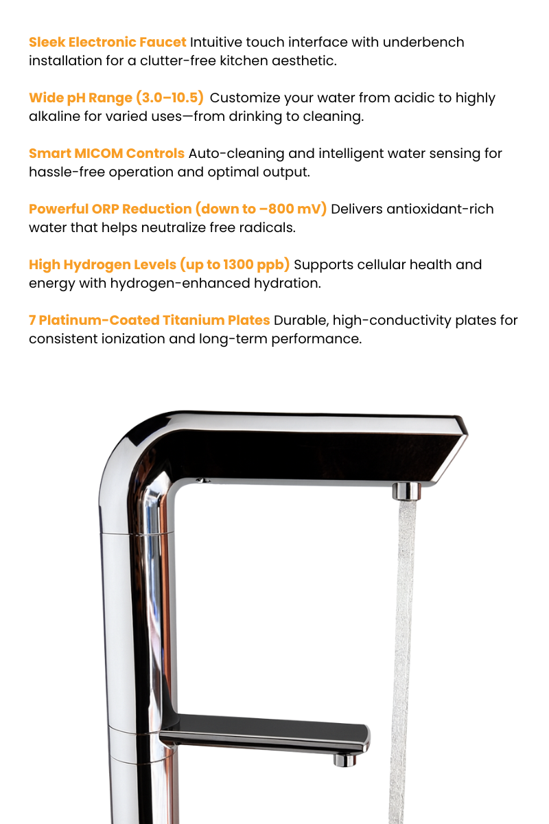 Custom Settings: Easily adjust pH levels and flow to suit drinking, cooking, or cleaning.